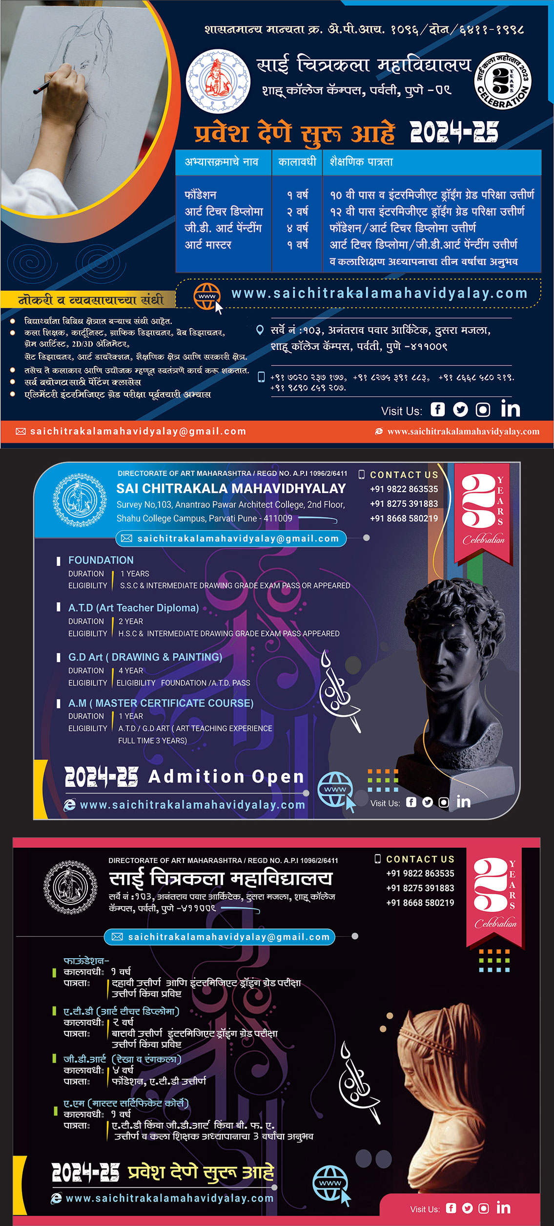 Also, to provide education opportunity to the students coming from rural areas to the city for art education, Mr. Narayanraoji Kshirsagar founded Sai Chitrakla Colleges on 21 August 1998 and Dhankawadi Balajinagar. The college started foundation and art education training classes from Pune.After this, a four-year Diploma in Drawing and Painting was started. Art master course is also going on. This year the college has made its debut in the 15th year of conducting such courses. During the last sixteen years, several peaks of success have been scaled. Students who have completed education from colleges are working in high positions in schools, colleges and companies related to arts sector. The college has more than 100 works of art by various artists.